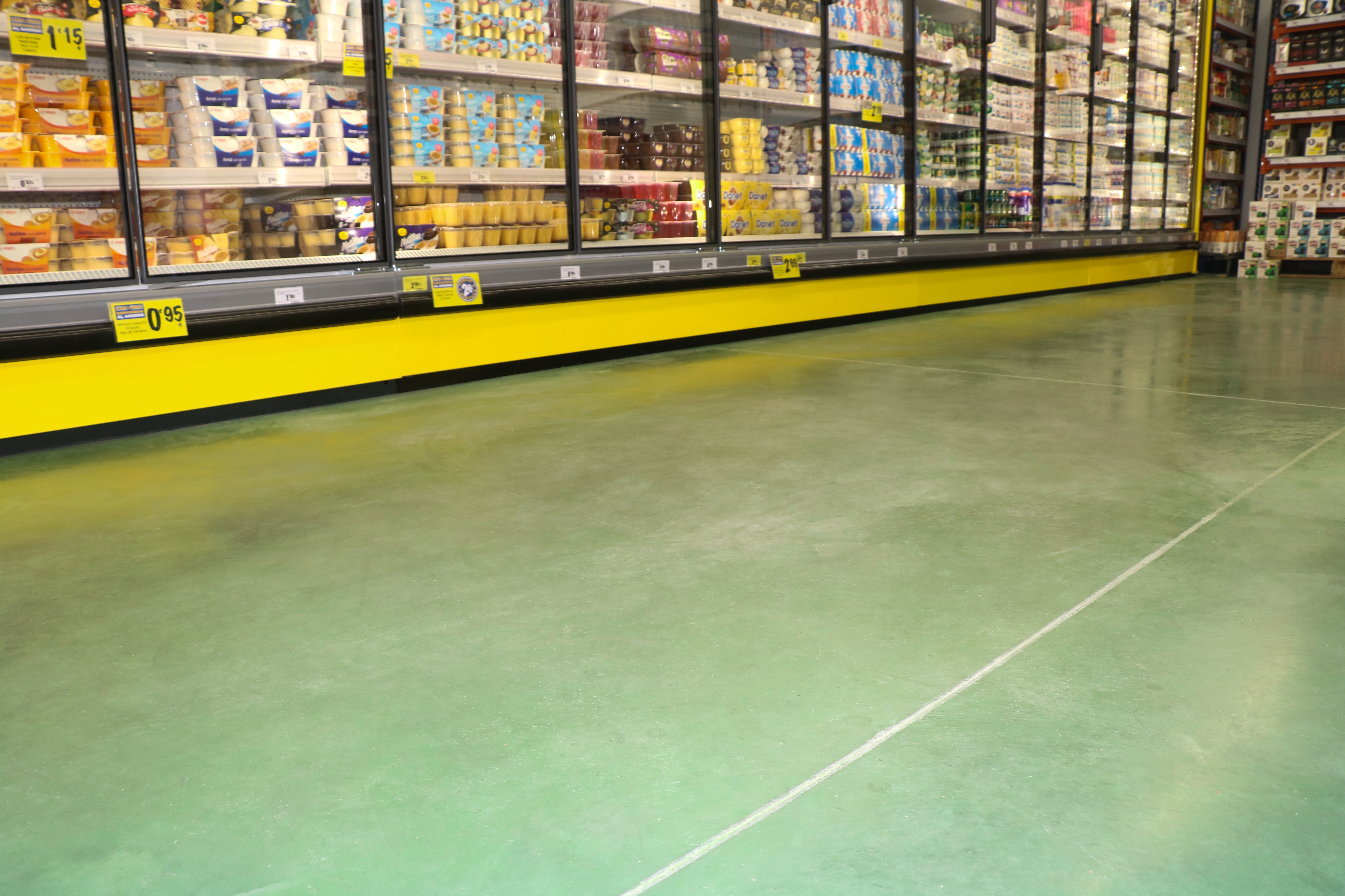 Pavimento continuo de hormigón pulido color verde con aplicación de fosilicatos de litio en terminación para conseguir acabo brillo.