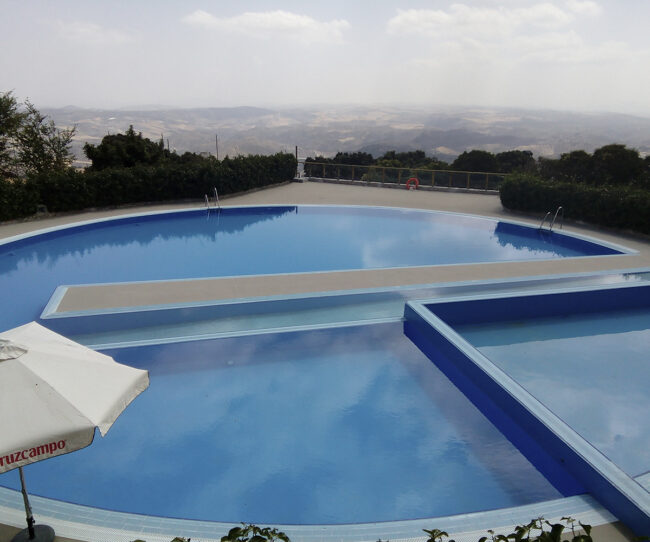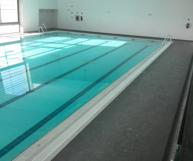 Revestimiento interior de vaso de piscina con resina epoxi y ejecución de playas con mortero semiseco de resina de poliuretano efecto planchado.