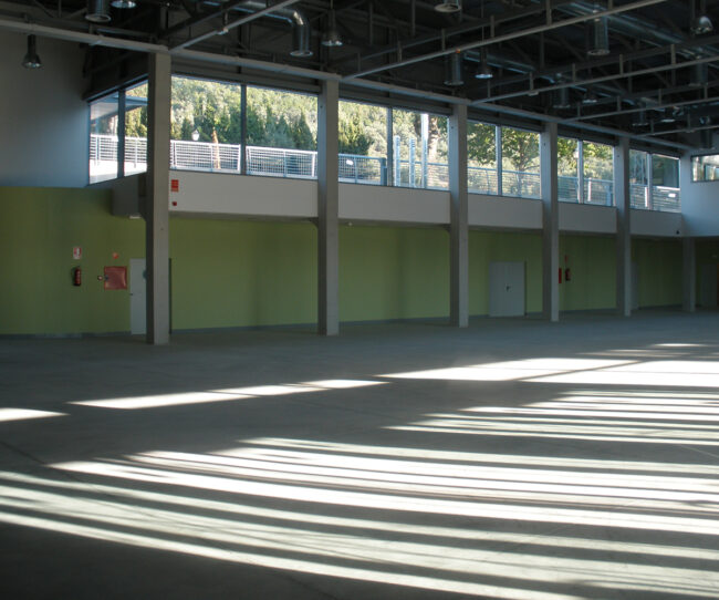 Pavimento continuo de hormigón pulido en pabellón cubierto multifuncional para la celebración de ferias comarcales y actos públicos.